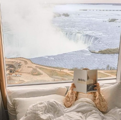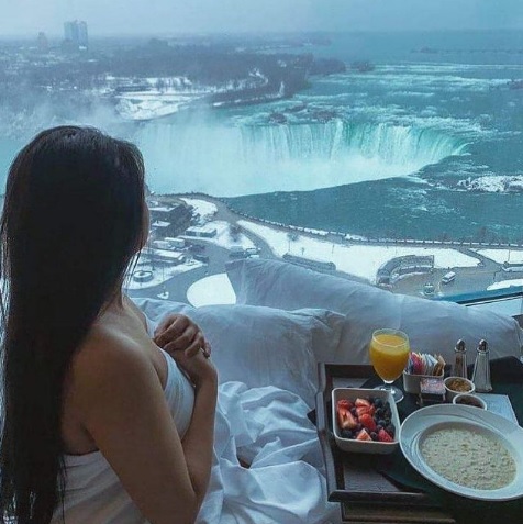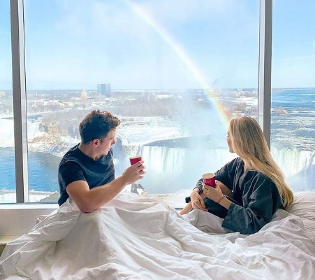 Affectionately dubbed “Girl in the Bed” at the hotels, guests reserve guestrooms and suites overlooking Niagara Falls and stage stunning photographs and selfies to share on social